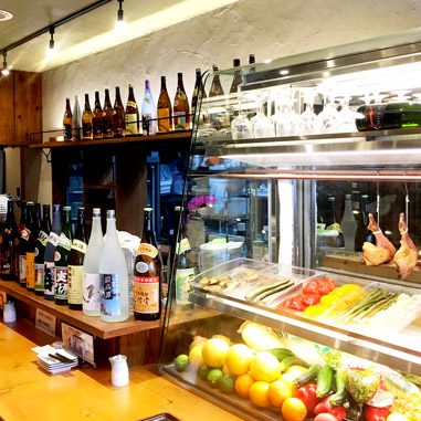 カウンターに存在感のあるショーケースを演出兼用で設置。提供する素材をアピールできるレイアウトに改装しました。また、ファサードは特大提灯を意図的に配置し表通りからお店を認知できるように配置しました。